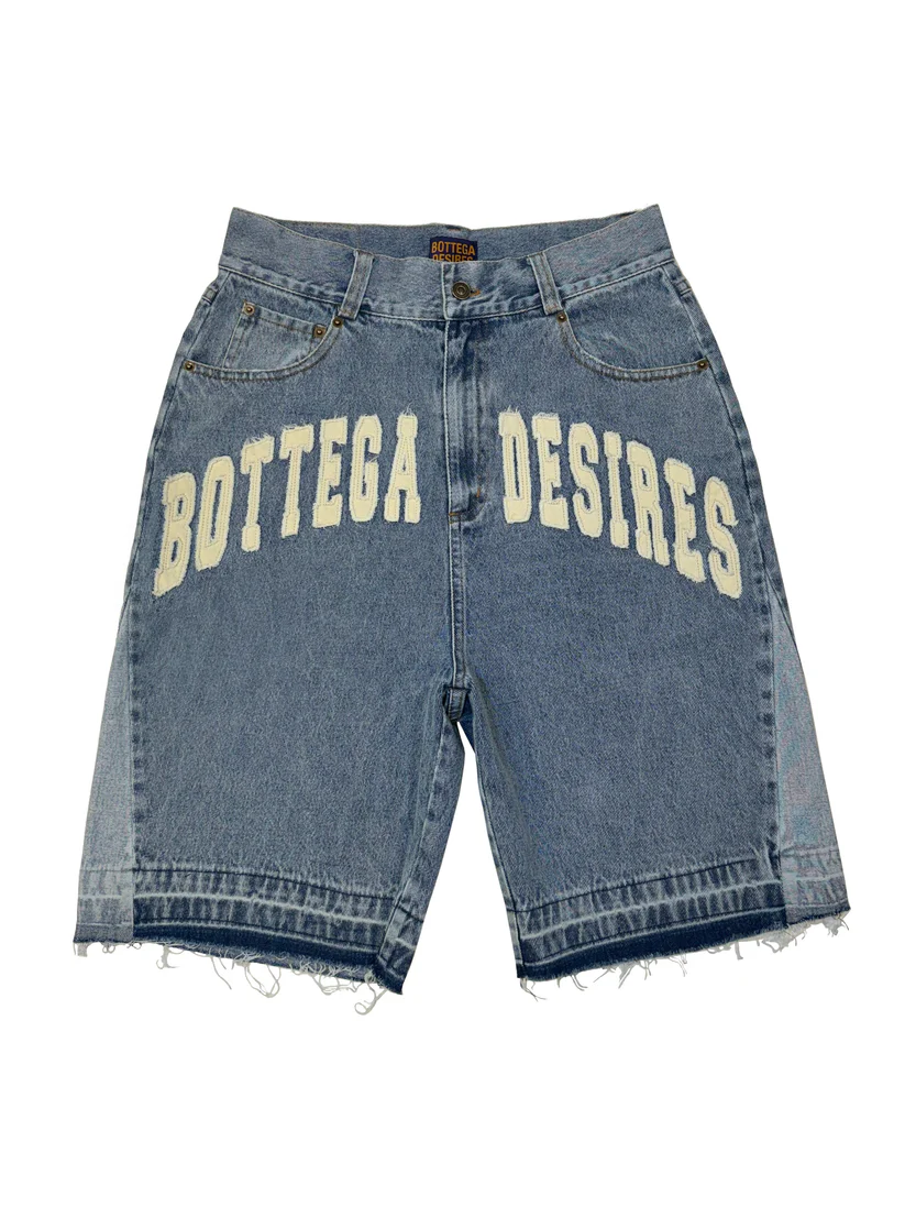 Refresh your streetwear wardrobe with the Bottega Desires Blue Denim Shorts, designed with a clean vintage wash and bold signature branding. Crafted from premium-quality denim, these shorts offer lasting comfort, durability, and standout style. The raw-cut hem adds an effortless edgy touch, making them perfect for summer fits, casual street looks, and daily wear. A versatile piece for anyone who loves modern fashion with a classic denim feel.